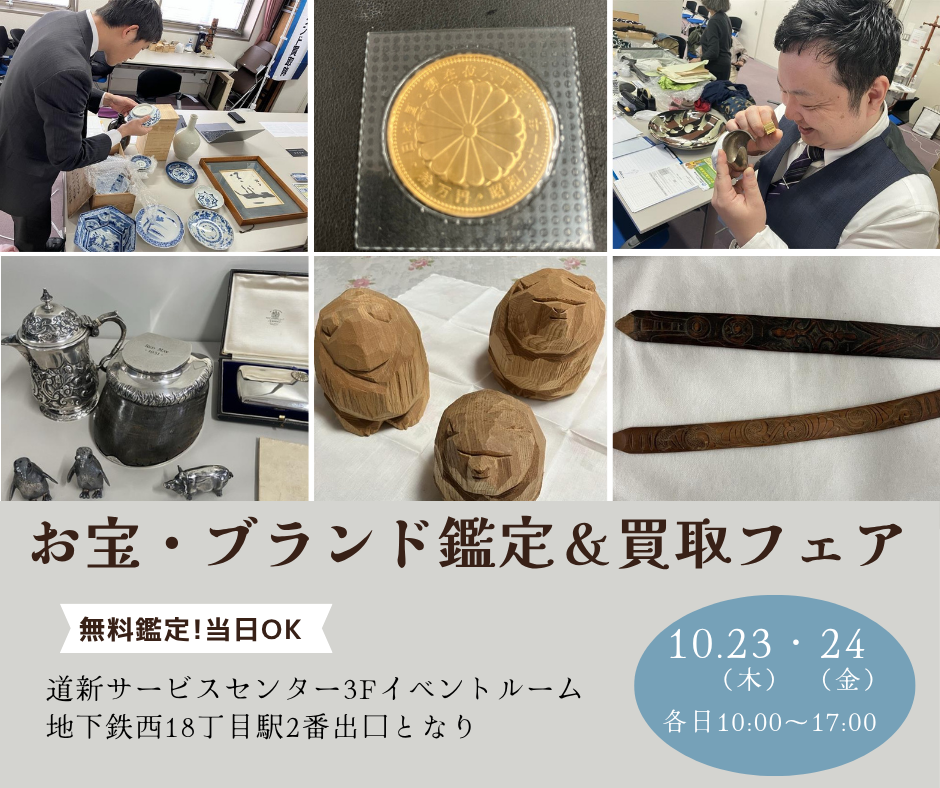 今月10月23日(木)・24日(金)は、鑑定実績豊富な目利きのプロが目の前で鑑定してくれるイベント『お宝・ブランド鑑定&買取フェア』を開催します。