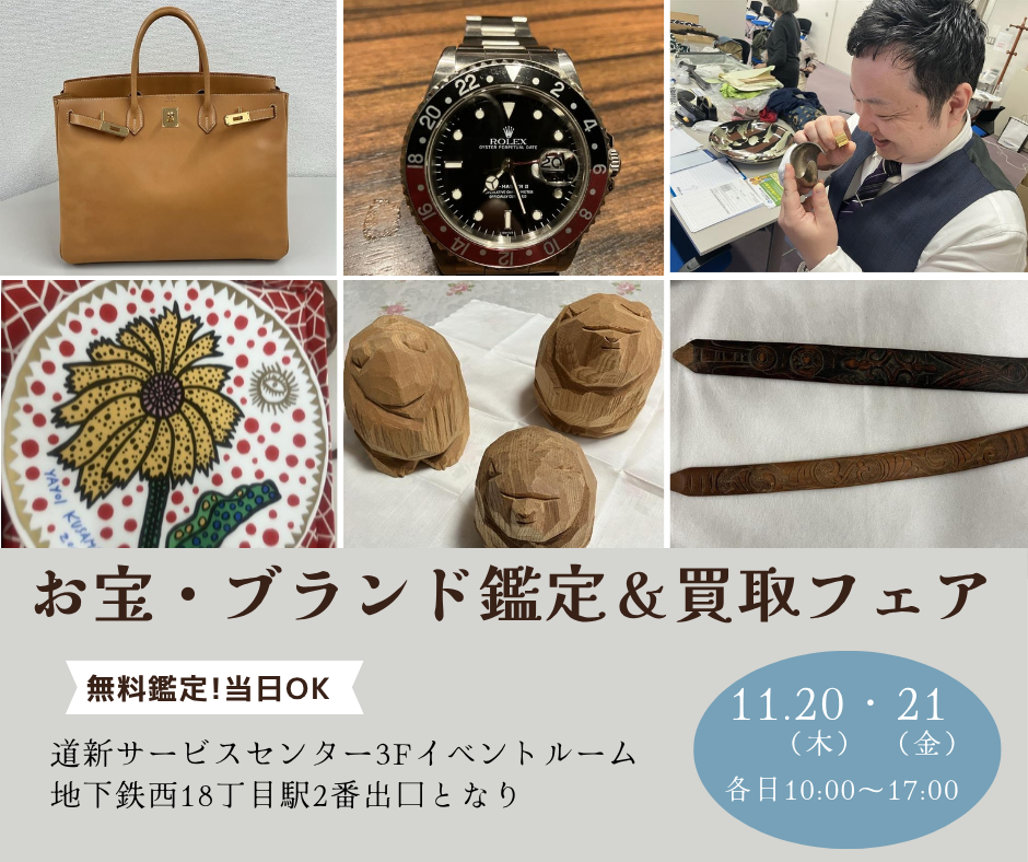 今月11月20日(木)・21日(金)は、鑑定実績豊富な目利きのプロが目の前で鑑定してくれるイベント『お宝・ブランド鑑定&買取フェア』を開催します。