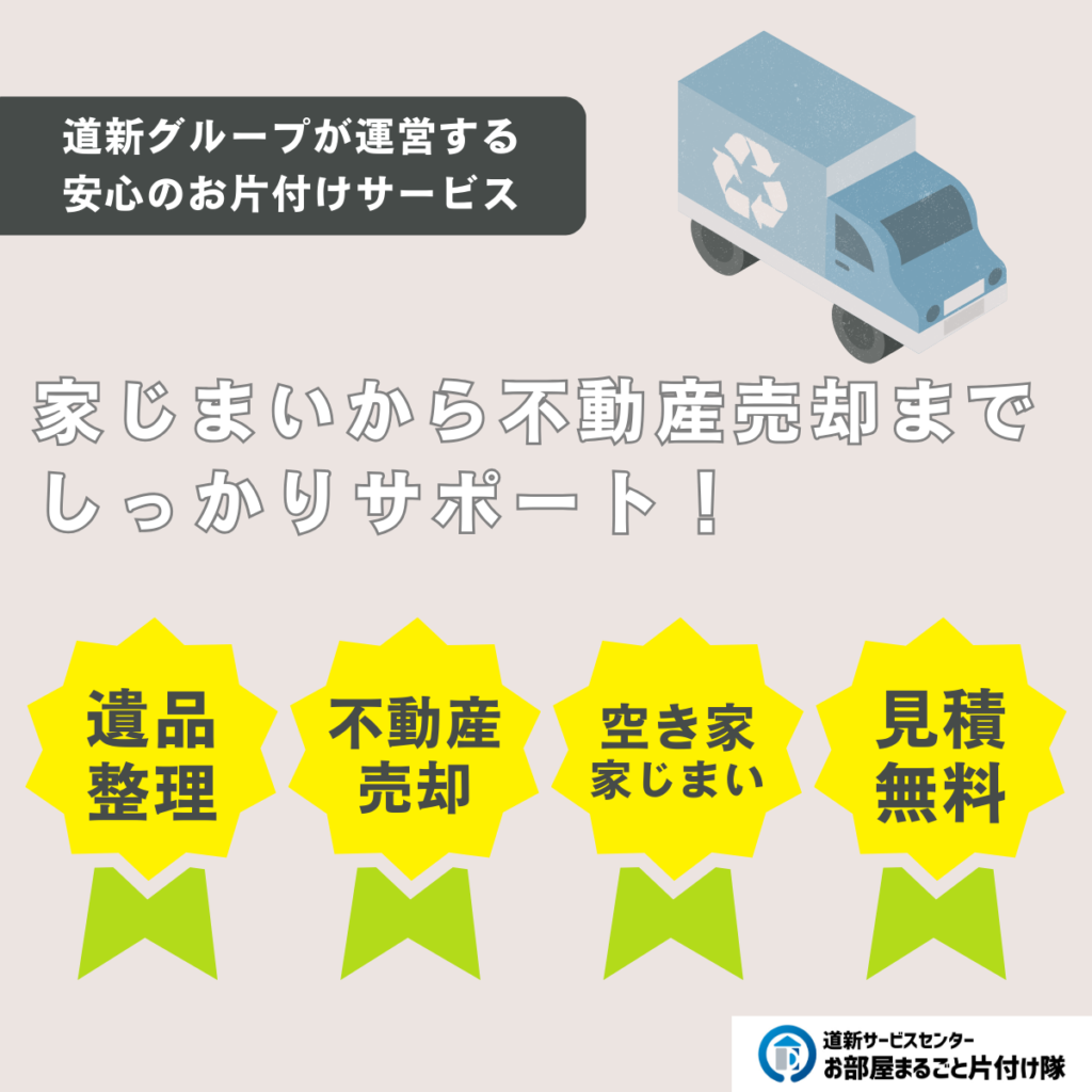 遺品整理や生前整理、家じまい、空き家、ゴミ屋敷、不動産の相続・売却などお困りごとは「お部屋まるごと片付け隊」までお気軽にご相談ください。