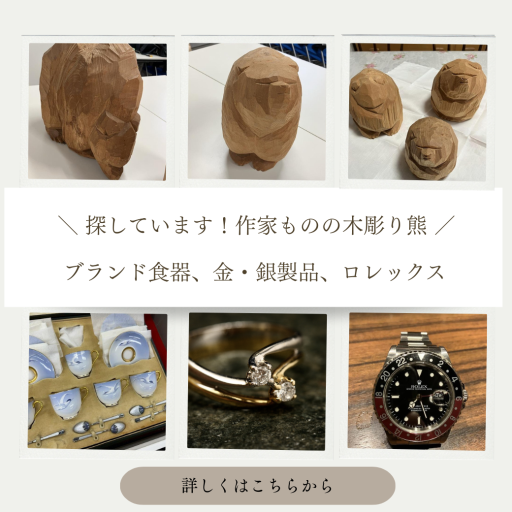 美術骨董品では、名工作家の木彫り熊やアイヌ民具・装飾品、銀食器、洋食器、中国美術などを探しています!北海道にゆかりのある作家の作品は高額査定の可能性が高いです!