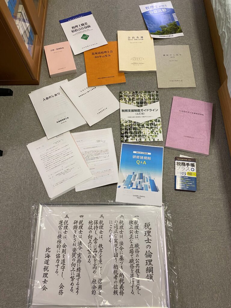 まず、税理士になったらというか、税理士登録するまでがとても面倒です。実は試験に合格するだけでは税理士を名乗ることはできず、各地の税理士会という組織に登録をしなければなりません。そのために登録申請書、住民票、履歴書など約20種類の書類を提出し、登録料11万円を支払います。ちなみに登録後も毎年、日本税理士会と北海道税理士会に合計16万円くらいの年会費を払います。書類審査が通ったら、北海道税理士会の支部会長との面談を経て、晴れて税理士として登録されます。ここまで、申請から2カ月くらいかかります。登録されると、税理士会から「税理士の倫理綱領」のパネルの他、入会のしおりや税法の書籍などが大量に送られてきます。