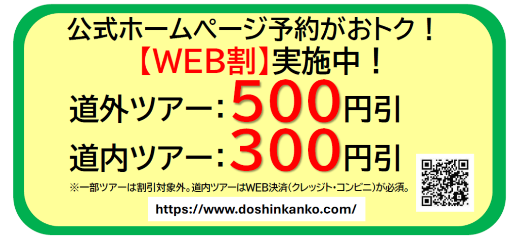 ・WEBからのご予約で通常価格から道外ツアー500円、道内ツアー300円引きとなります!