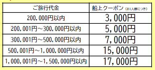 対象のクルーズ商品をご予約いただくと、船内での食事やお飲み物、お土産購入などに使える船上クーポンをプレゼントいたします 。旅行代金に応じてクーポン額もアップするので、自分へのご褒美にぴったりです 。